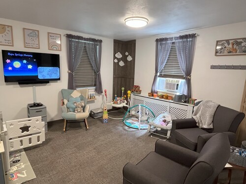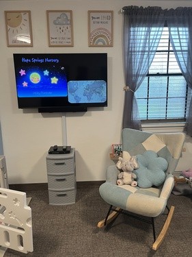 The Sunday service livestreams to a large screen tv in the nursery so that caregivers don't have to miss the service while taking care of their little one's needs.
